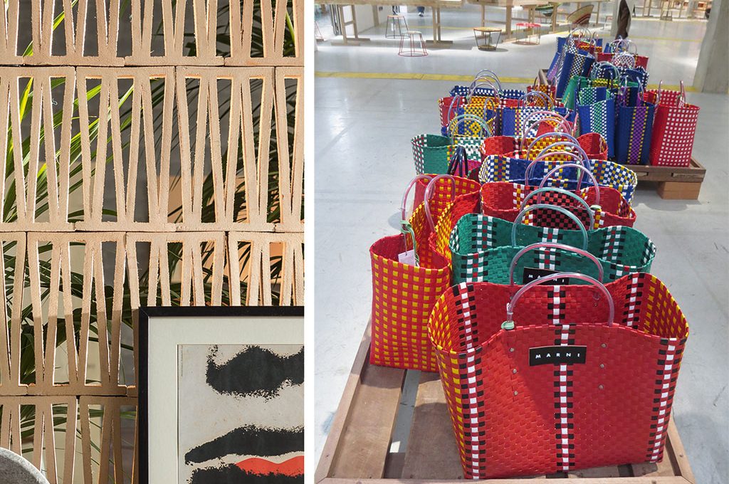 A sinistra: divisorio componibile Big Roman in terracotta [Mutina, il modulo cm 18x30h]. A destra: shopper in pvc intrecciato [progetto solidale Marni].