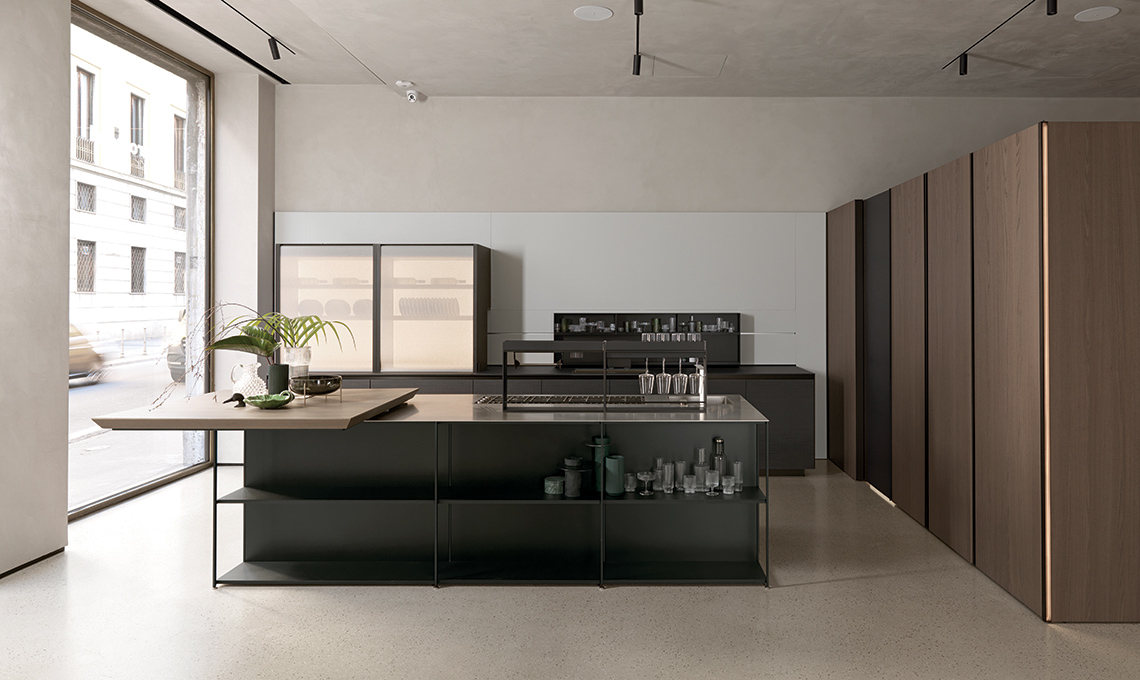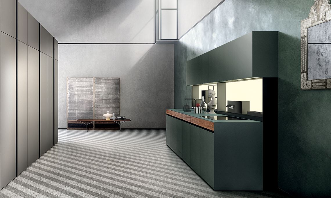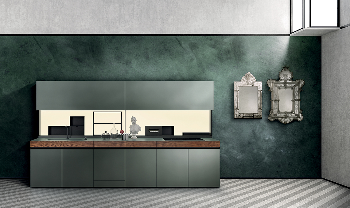Il sistema Sipario ha schienale attrezzato in alluminio anodizzato nero e vetro satinato laccato nero assoluto con accessori in alluminio. Pensili con frontali in Fenix NTM® verde comodoro e cappa integrata Fusion Advanced Novy antracite.