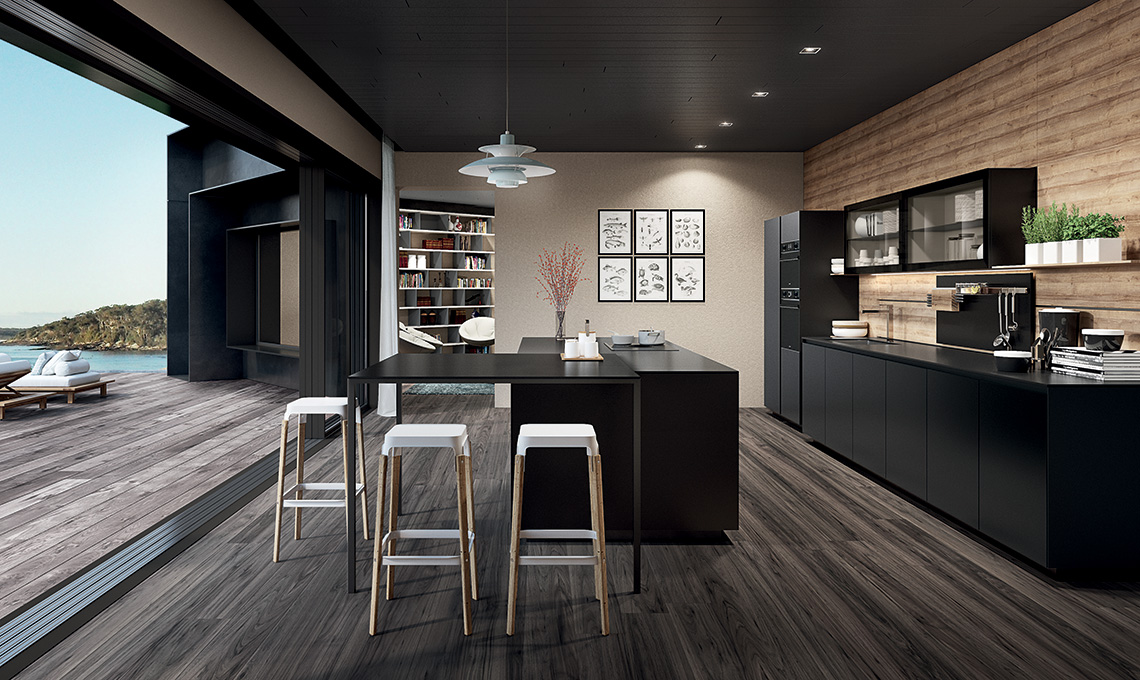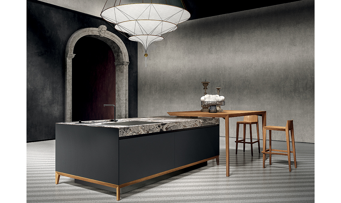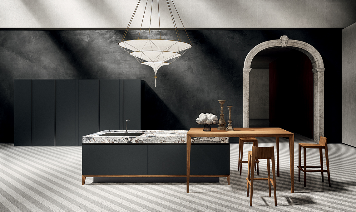 Sei è la cucina firmata Marc Sadler: ‘Sei come sei millimetri, ovvero lo spessore di piani, fianchi, mensole, accessori… i pannelli sembrano lame e solo il savoir faire italiano lo ha reso possibile’. (M. Sadler). In questa versione ha basi con struttura antracite, frontali Fenix NTM® nero ingo, pietra naturale marmo ocean storm, sistema di apertura cassetto + anta estraibile, basamento in legno da cm 19h, maniglia Sei in alluminio anodizzato nero. Top Sei in pietra naturale marmo ocean storm con vasca integrata. Colonne con struttura antracite, frontali in Fenix NTM® nero ingo, anta a pavimento con maniglia Sei verticale in alluminio anodizzato nero, moduli Cabinet, schienale retroilluminato Solaris Back e meccanismo Kessebohmer Premio.