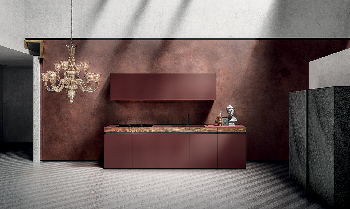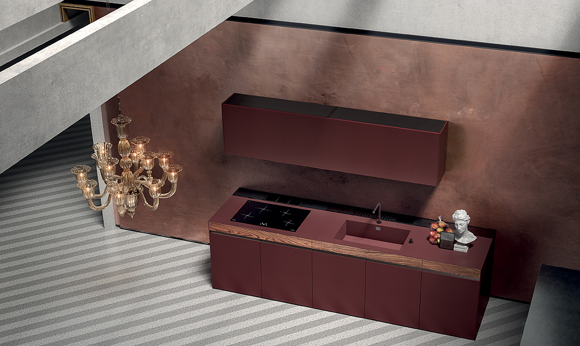 La cucina Sei firmata Marc Sadler, in questa versione ha struttura della basi antracite, frontali in Fenix NTM® rosso jaipur, olmo naturale stracciato nero e sistema di apertura cassetto + anta battente, maniglia Sei in alluminio anodizzato nero. I pensili hanno frontali in Fenix NTM® rosso jaipure la cappa integrata Fusion Advanced Novy antracite.