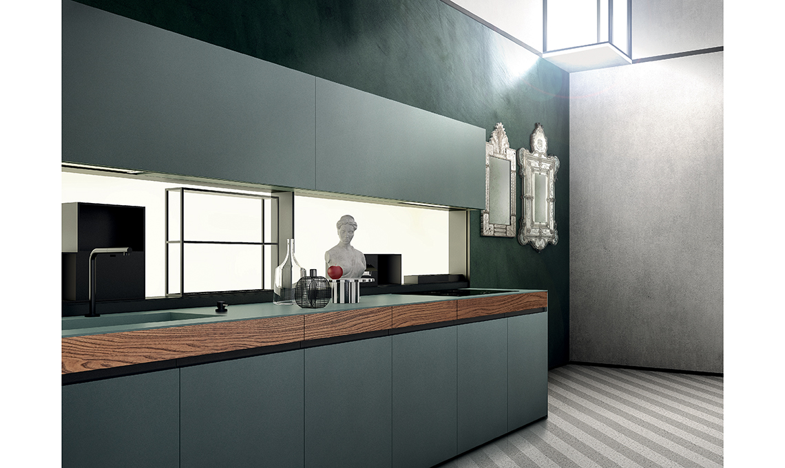 In questa versione la cucina Sei firmata da Marc Sadler ha le basi con struttura antracite e frontali in Fenix NTM® verde comodoro più olmo naturale stracciato nero con maniglia Sei in alluminio anodizzato nero e top Sei in unicolor Fenix verde comodoro con vasca in unicolor integrata. Il sistema Cabinet ha schienale retroilluminato Solaris Back e meccanismo Kessebohmer Premio.