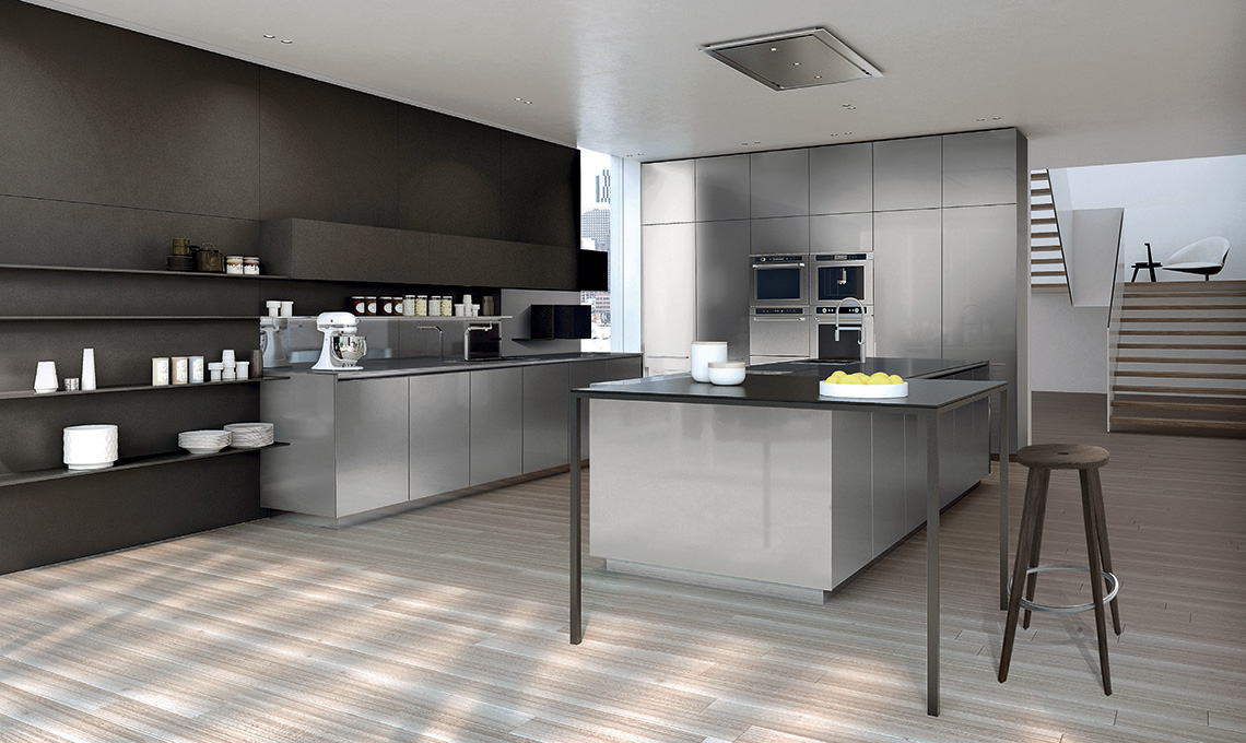 Una cucina da veri chef il modello Free Steel, massima espressione tecnologica di solidità e leggerezza estetica: in acciaio inox AISI 304 satinato antimpronta, 100% riciclabile che assicura doti di resistenza e igiene uniche. Un total look con ante di basi e colonne più coprifianchi in acciaio inox satinato antimpronta, maniglia Regula cromo lucido, profilo gola e zoccolo da 8 cm in alluminio finitura acciaio inox. Piano di lavoro in acciaio inox effetto pieno spessore 8 mm.