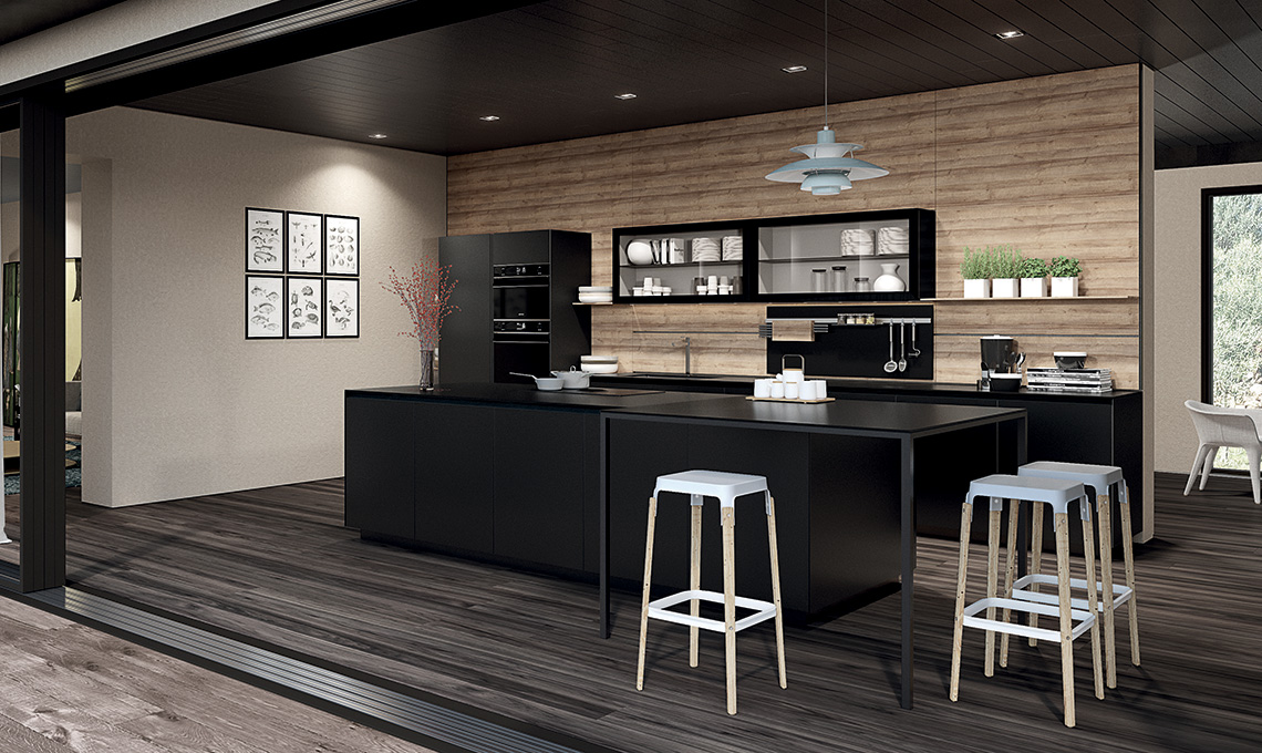 I pensili Antis sono in laccato nero assoluto opaco, la boiserie Horizon e gli accessori con magnete sono in laccato nero assoluto opaco e i profili di testa in alluminio anodizzato nero. Tavolo snack Thin in laccato nero assoluto opaco.