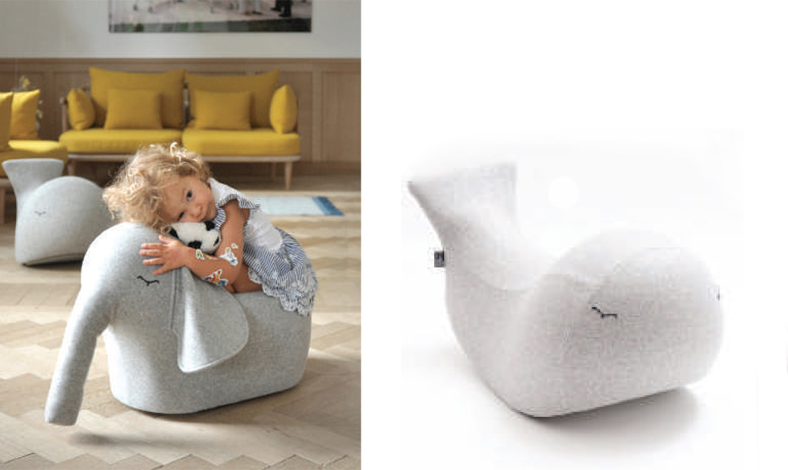 Pouf balena e elefante sui quali i bambini possono non solo sedersi, ma anche dondolarsi. Pouf balena [€375], il pouf elefante è provvisto di ruote [€395]. Tutto Bada & bou.