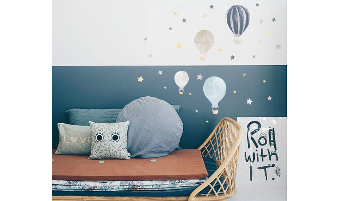 Adesivi da muro, riposizionabili per creare il motivo preferito.Stampati su carta adesiva a3 di alta qualità con inchiostri sicuri a base d’acqua, totalmente inodore. Hot Air Balloons Blue [Pop! By Gaea €15].