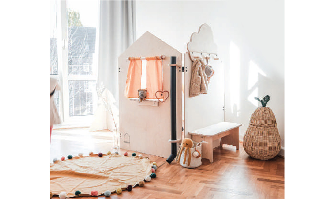 Wooden Playhouse è la casetta per bambini in multistrato di betulla naturale pieghevole dal design scandinavo e minimal [Stadthus, €379,19].
