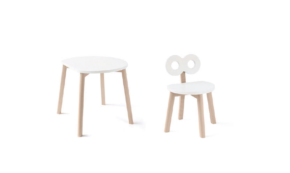 Tavolo con ripiano bianco, adatto per tutti i tipi di progetti artistici, abbinato al design divertente e senza tempo della sedia per bambini. Tavolo Half-moon e sedia Double-o [Ooh Noo, €108,50 e €89,50].