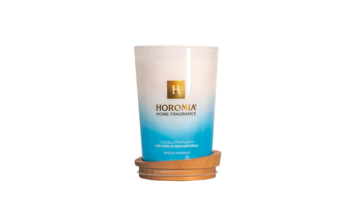 La candela profumata Brezza Minerale, con cera di soia naturale, diffonde note floreali e marine [Horomia]