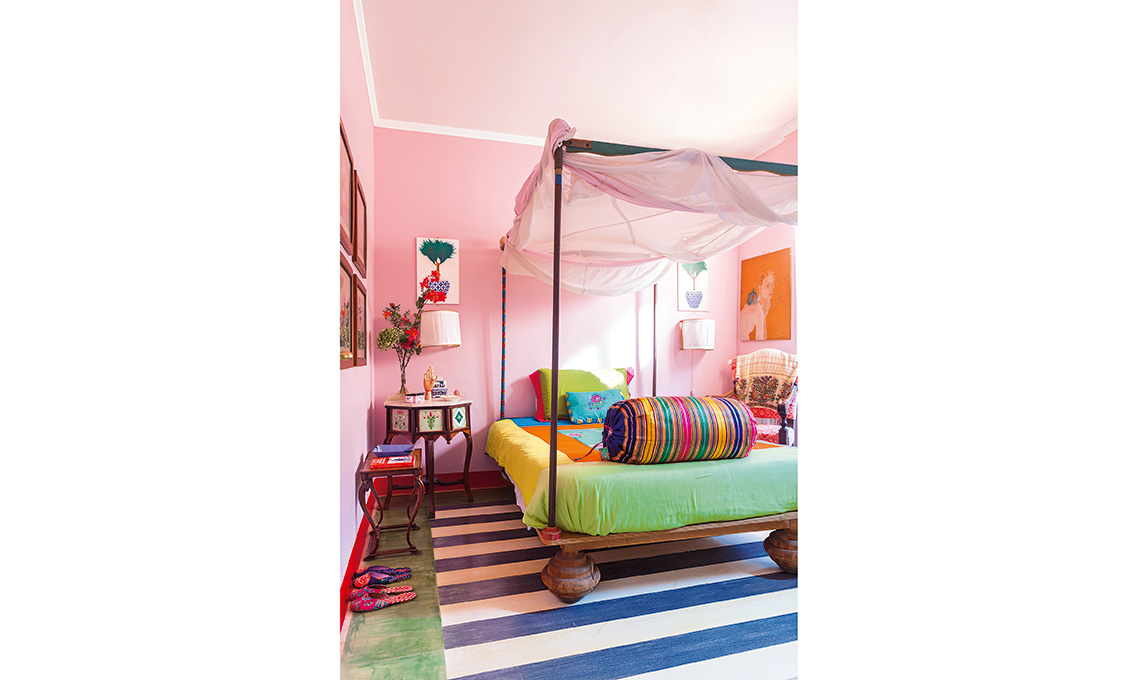 Perfino gli spazi più privati sono intrisi di un’atmosfera carica di esotismo: il letto è un’isola di colore attorniata da ‘mobili d’affezione’ come il tavolino persiano, che sostituisce il comodino, mentre sulla vasca un nodo tiene a bada gli svolazzi della tenda in organza, materiale, sottilissimo e impalpabile, che sembra aria colorata, frammento di nuvola da toccare.