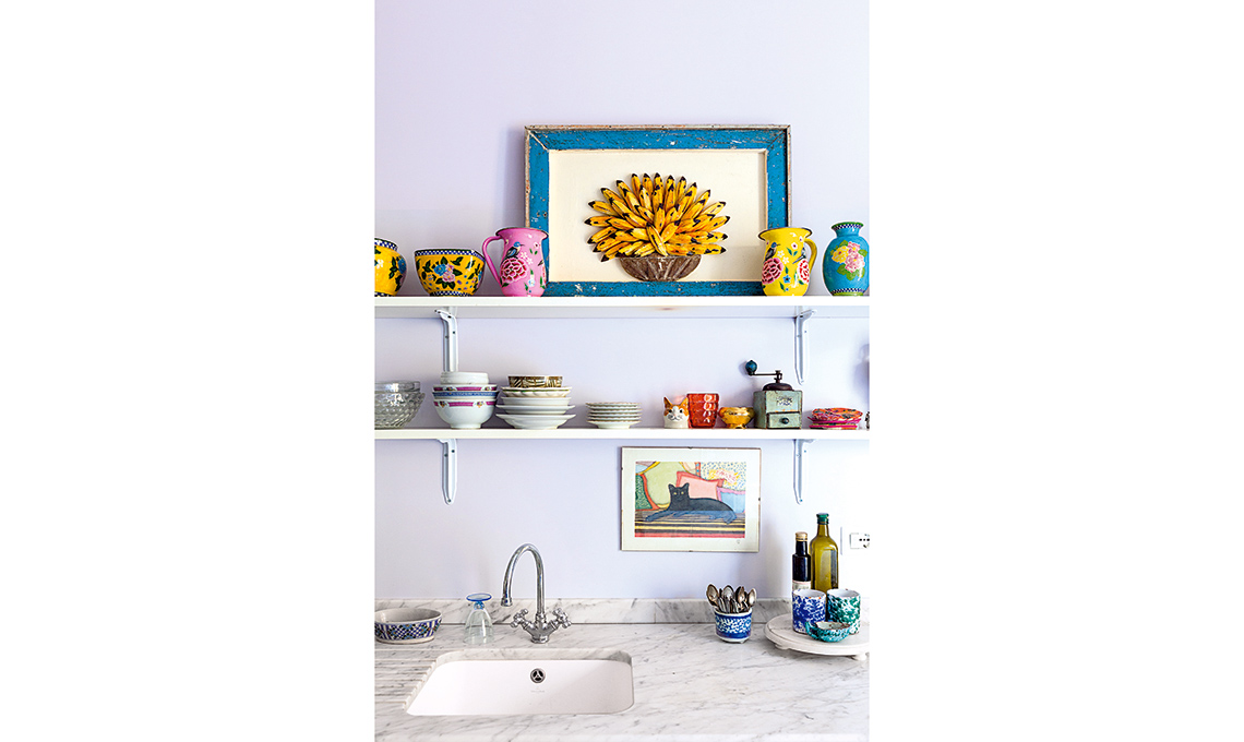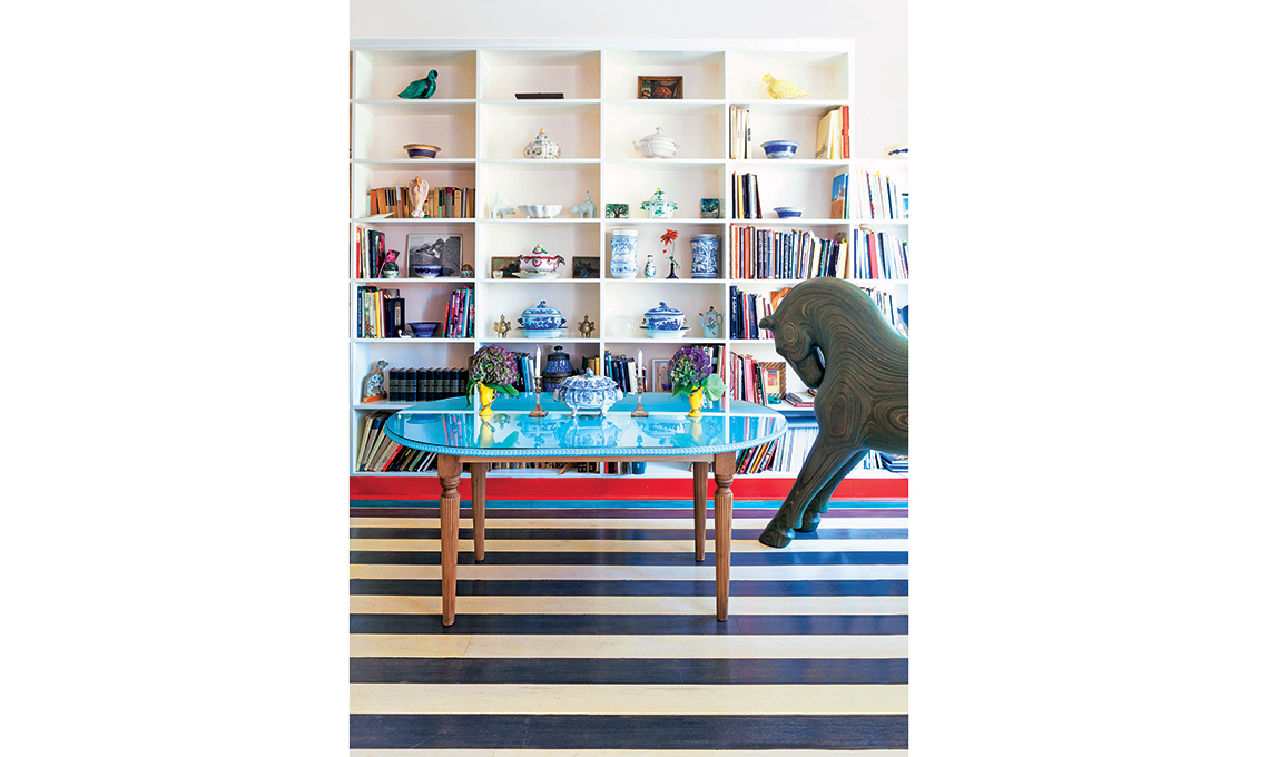 turchese lo modernizza e ne racchiude il perimetro, come fosse un tappeto. Tutto è stato dipinto a mano dalla figlia Ida.