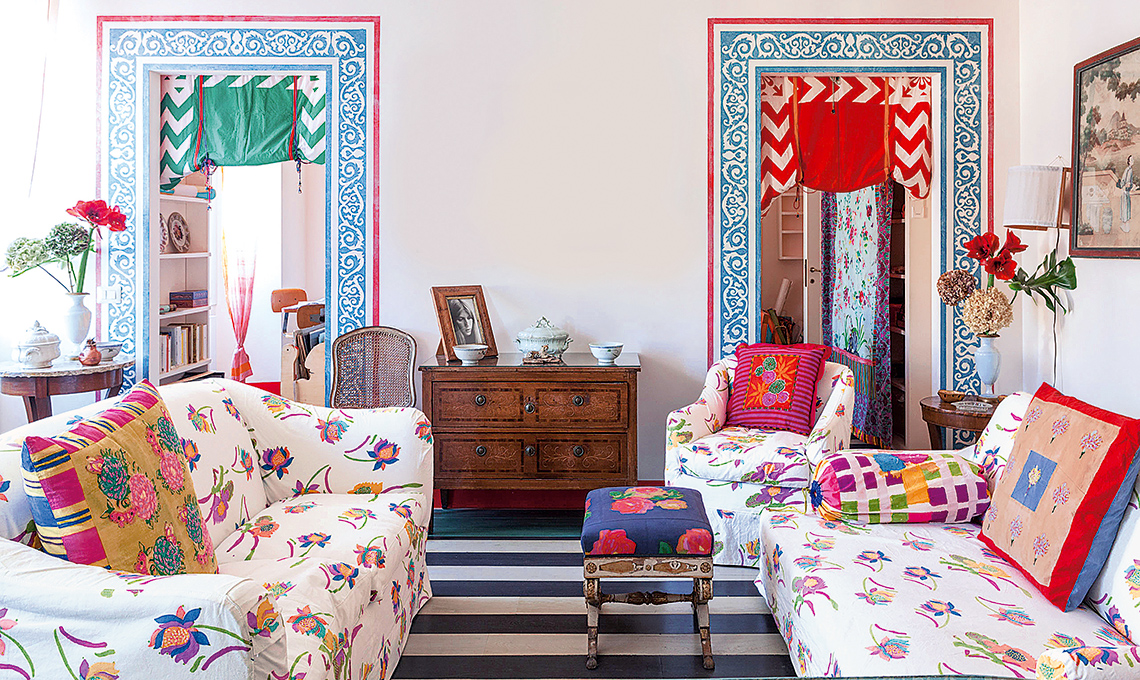 A casa di Lisa Corti, storica e raffinata creatrice di tessuti dall’animo cosmopolita, mille variopinti grafismi realizzati a mano vibrano in ogni angolo. Così il colore diventa magia.