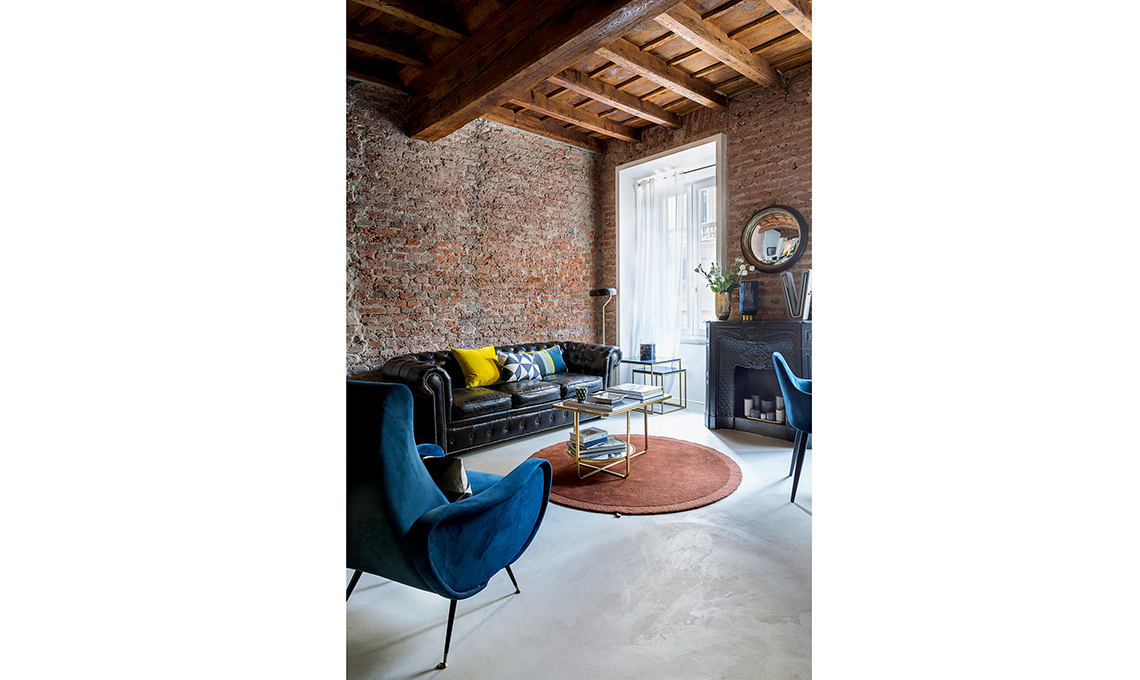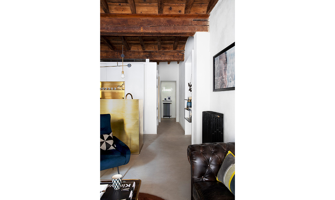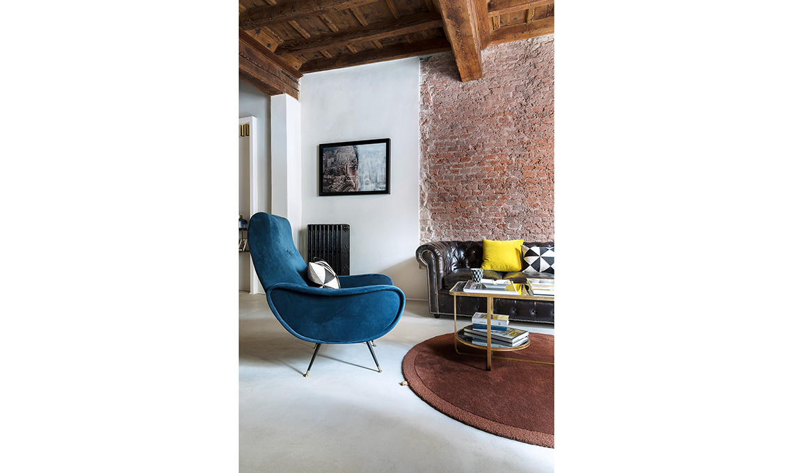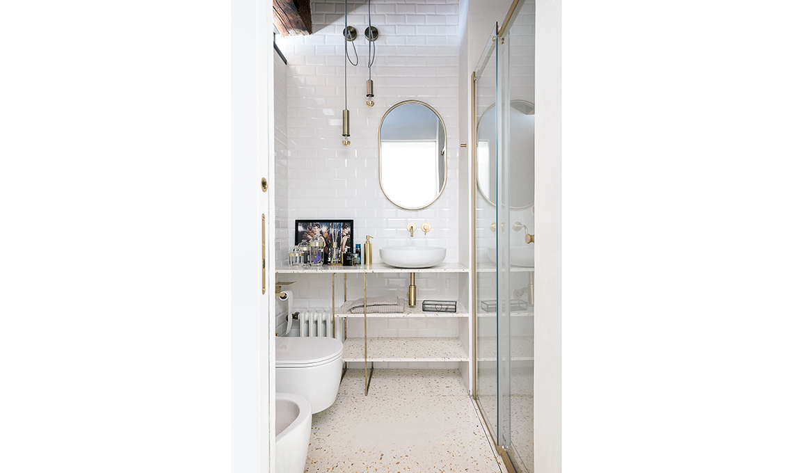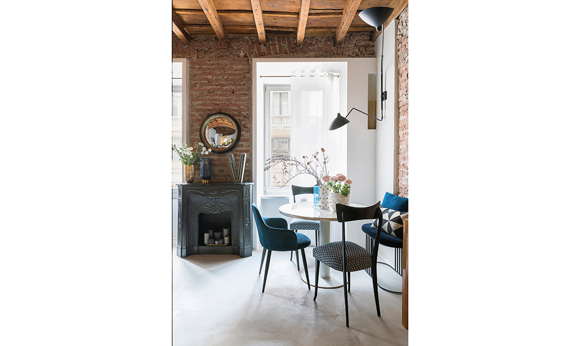 Nell’estetica, la proprietaria ha messo in evidenza il carattere storico dell’immobile portando alla luce i vecchi mattoni, dando lustro alle travi, usando finiture rétro come l’ottone e il terrazzo veneziano. Il décor finale, glam ma per nulla pretenzioso, è opera della nostra stylist Cristina Gigli. Che stile!