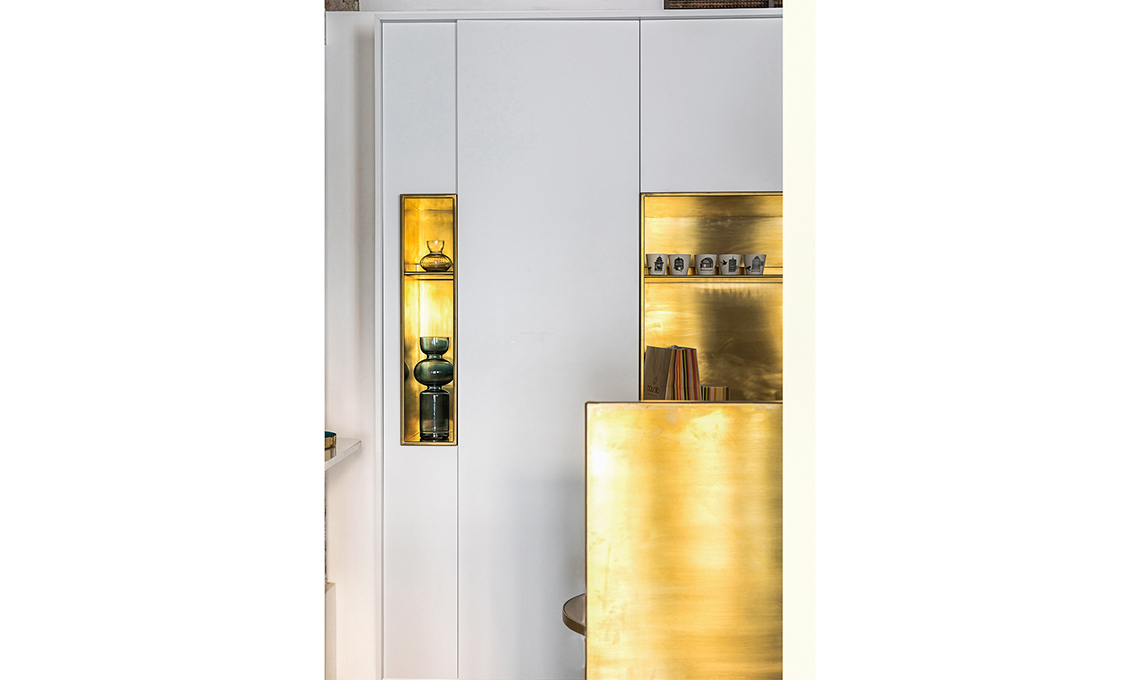 e propria... isola: le basi sono profonde 70 cm, filtrate da un pannello di ottone che si alza 30 cm dal piano.
