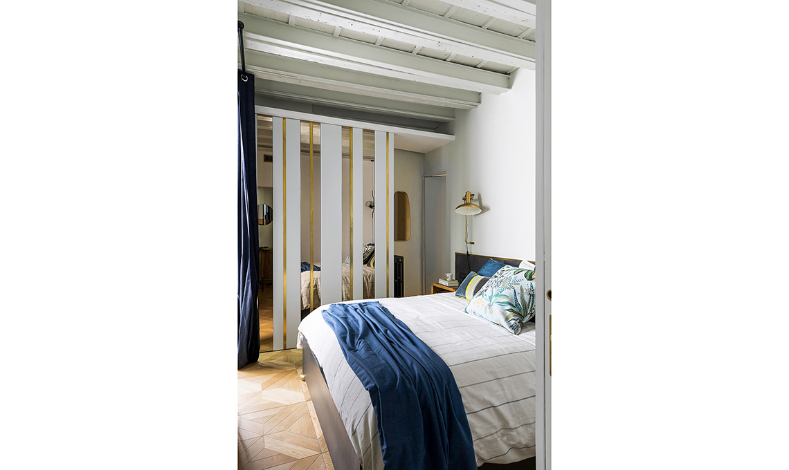 L’armadio è un altro elemento su misura: riprende il colore grigio ma è impreziosito con fasce in specchio bronzato e ottone. Nuovo ma con un’eco déco.