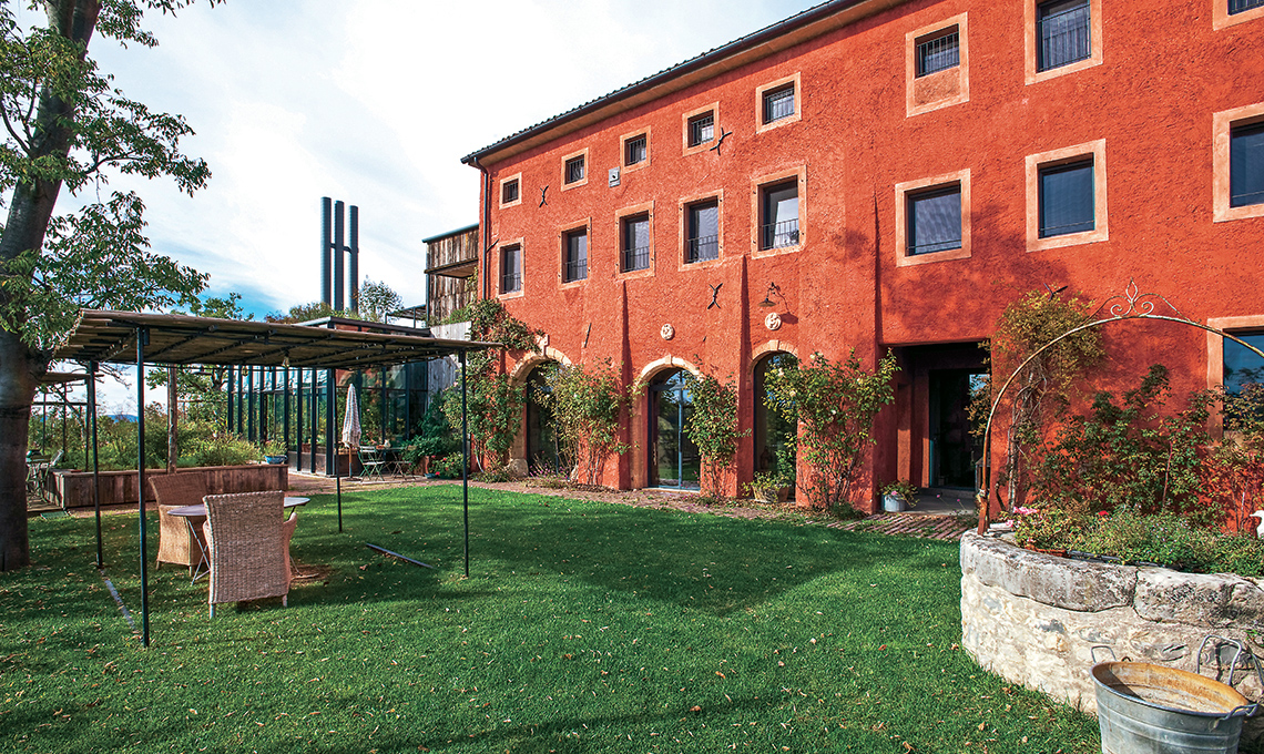 La zona relax outdoor è il punto privilegiato per ammirare la facciata seicentesca. Le canne fumarie della cucina e del riscaldamento a pellet, alternativa ecologica e conveniente, danno un tocco industrial accanto alla serra.