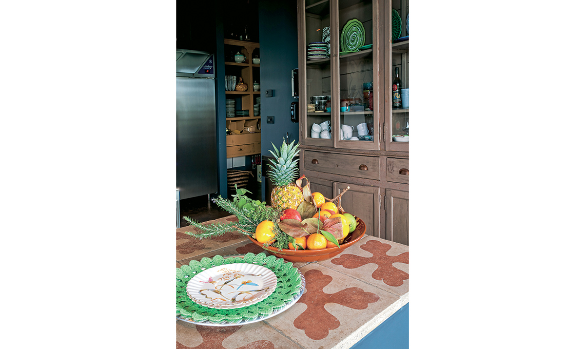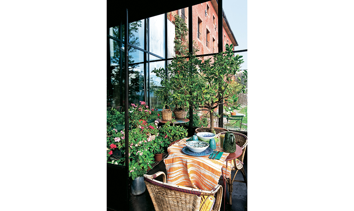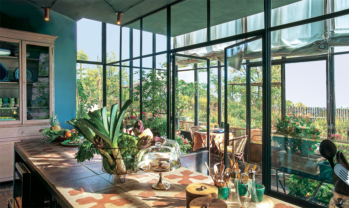 l giardino d’inverno è diviso in due: una parte è destinata alla limonaia, ricovero per le piante più delicate, l’altra è un prolungamento della cucina che così è inondata di luce. La separazione evita la dispersione del calore.