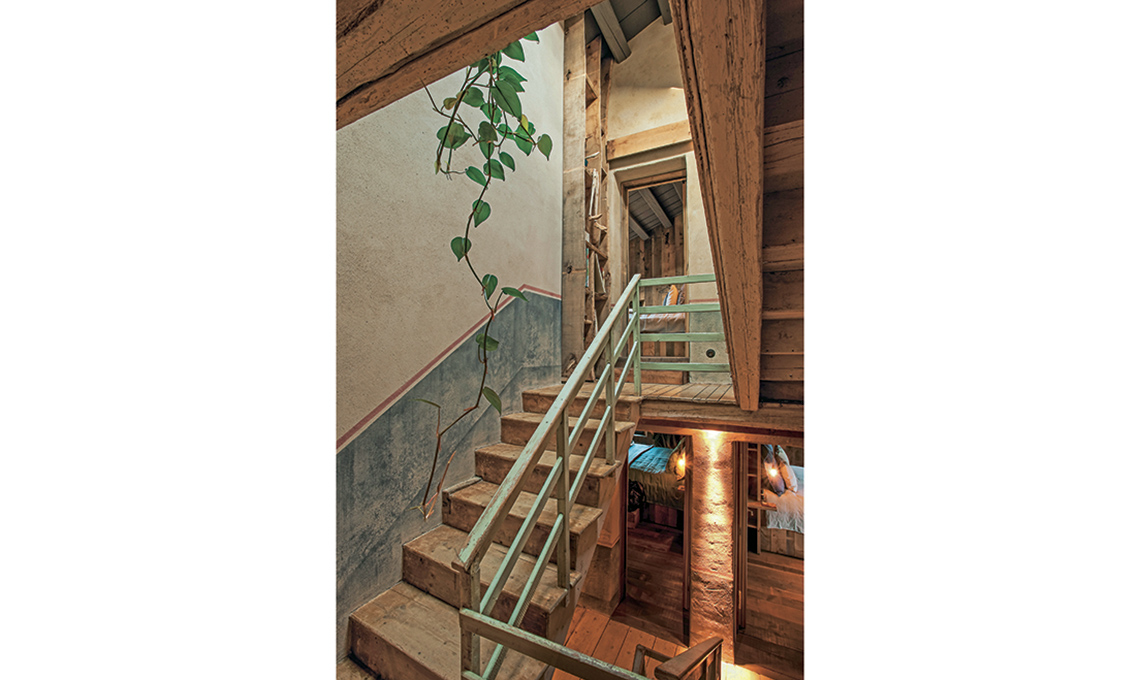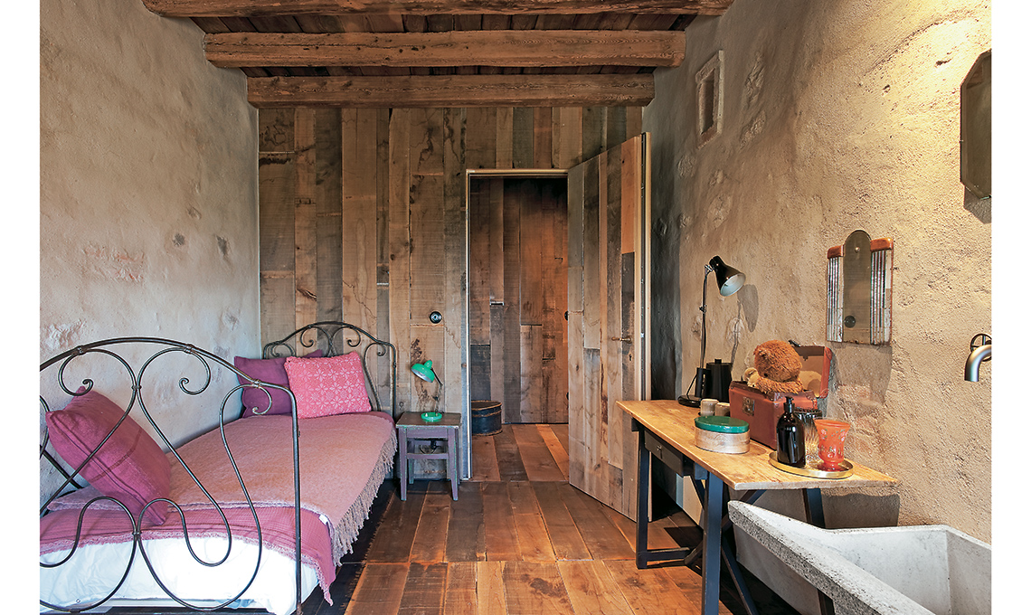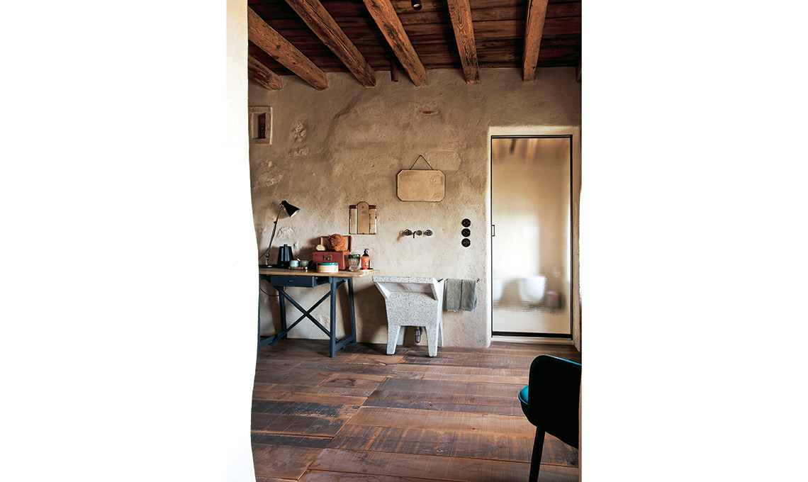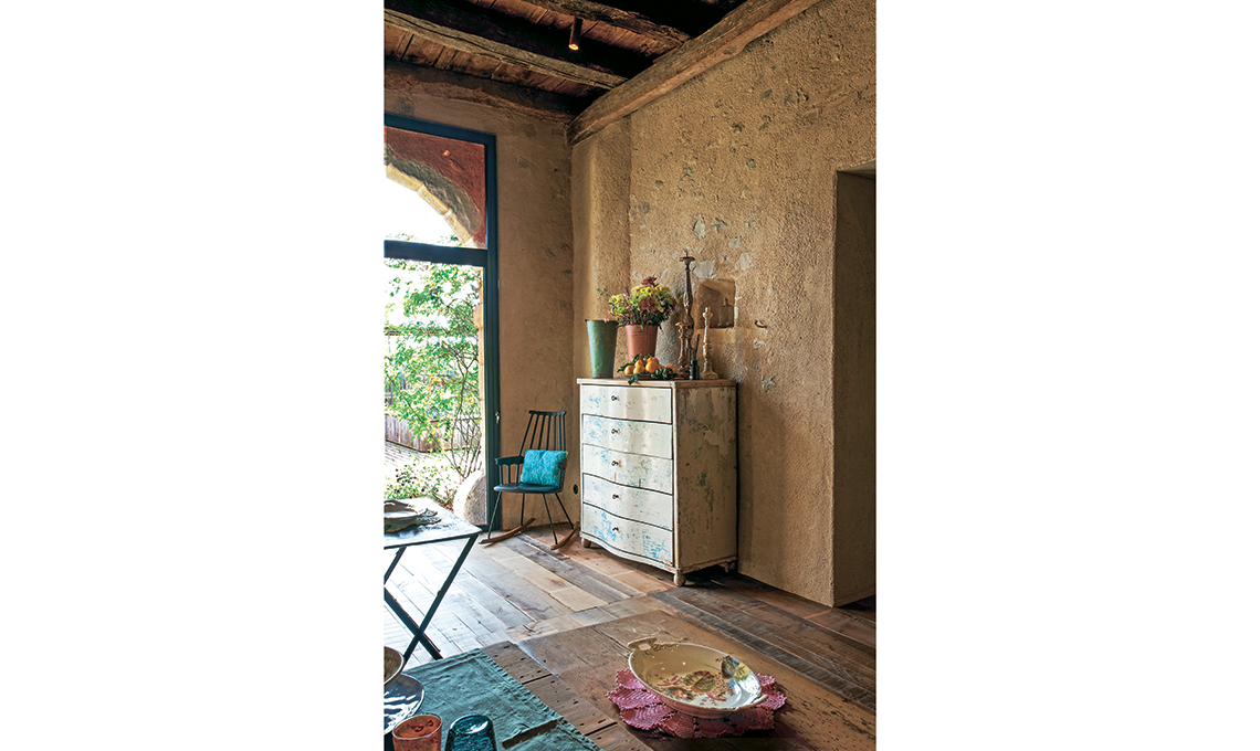 Il pavimento in assi di legno e i muri grezzi sono presenti in tutta la casa, ma ciò che rende unico ciascun ambiente sono i mobili vintage, gli oggetti di famiglia, le ceramiche artigianali.
