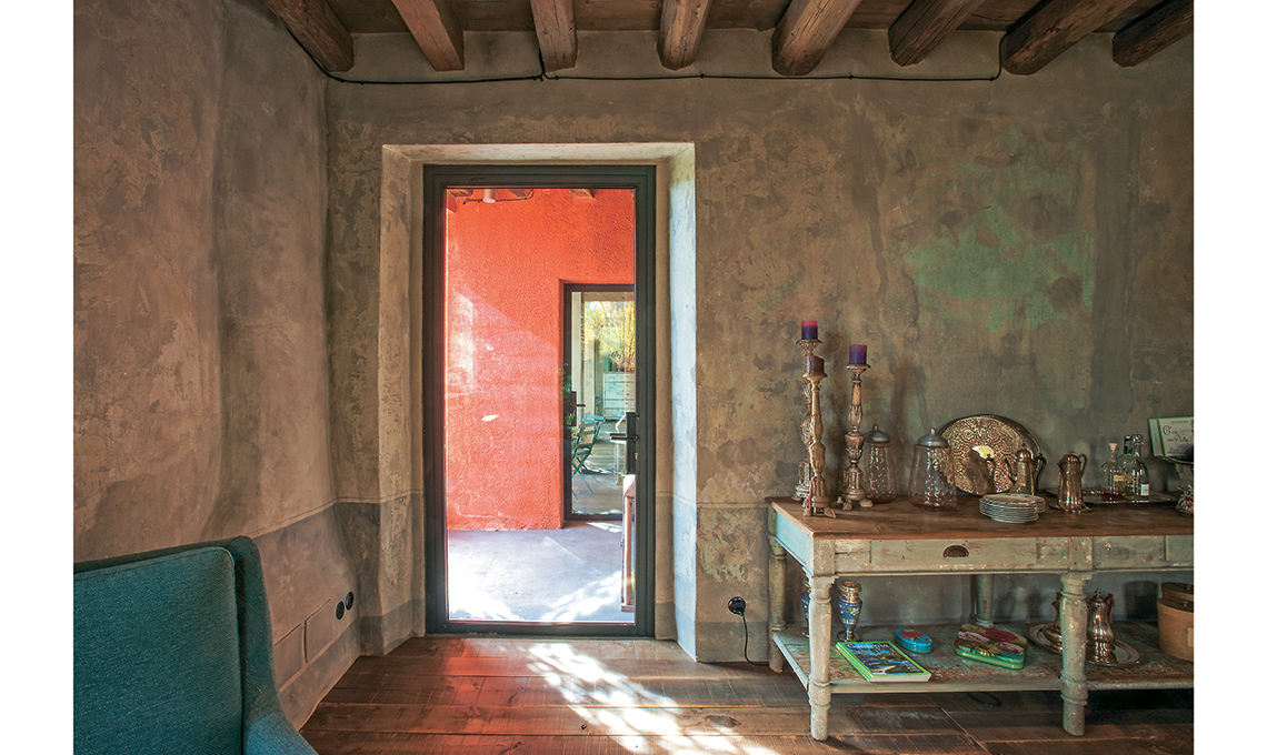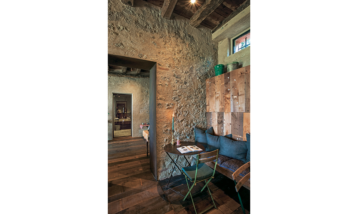 La pavimentazione in legno sottolinea la continuità fra le tre sale al piano terra, che si aprono una dopo l’altra. «Le assi, di misure diverse, sono state recuperate da un falegname locale: comporle è stato un lavoro certosino, ma il risultato è sorprendente, sembrano qui da sempre!» esclama Roberta. Nel salottino dalla foto