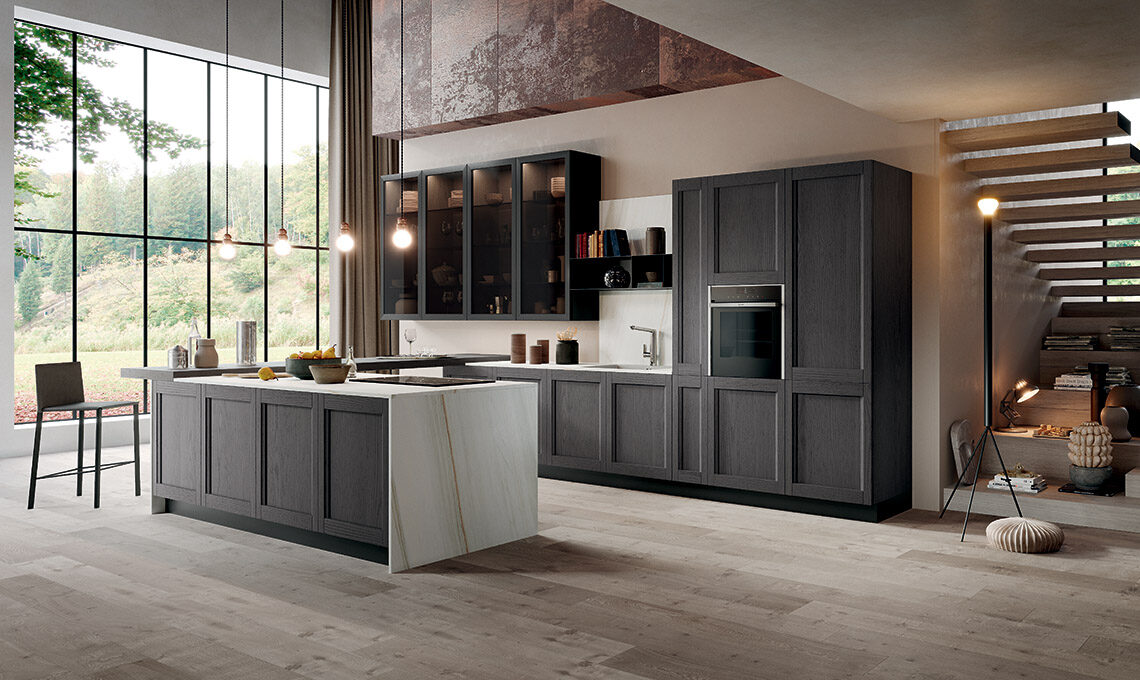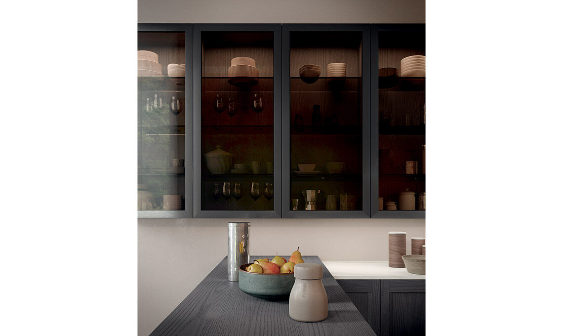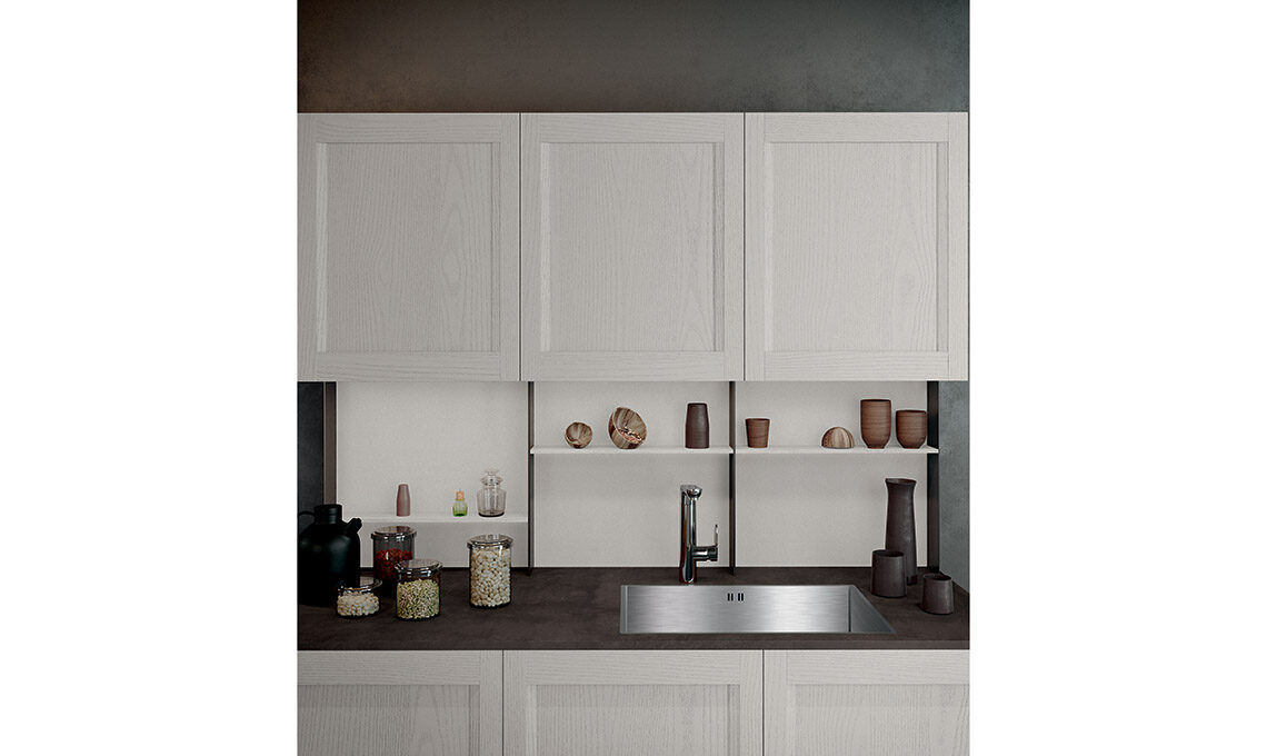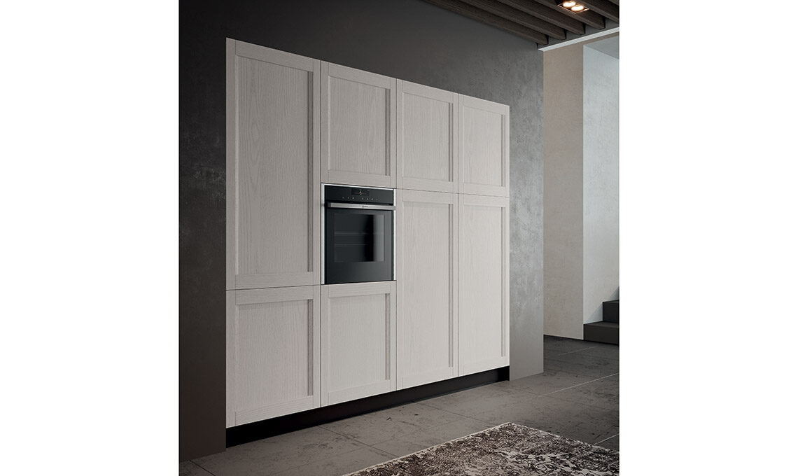 Grazie ad una gamma di finiture trasversali e a nuovi complementi dedicati, dà la possibilità di declinare la cucina nel 'gusto' che più ci appartiene: moderno, classico, arrivando anche al contemporaneo per rendere ogni cucina unica, come chi la sceglie. L’anta a telaio massello con particolare presa integrata la rende facile da abbinare a ogni scelta di finitura, si tratti di laccati poro aperto, decapè o nella combinazione con vetro.