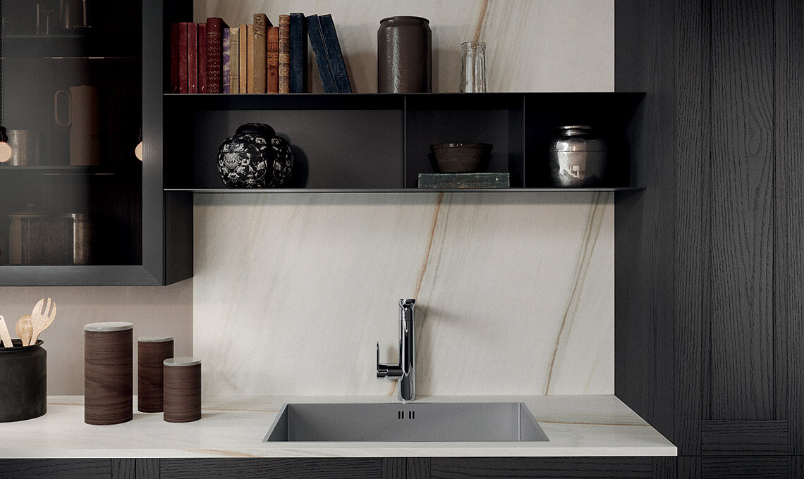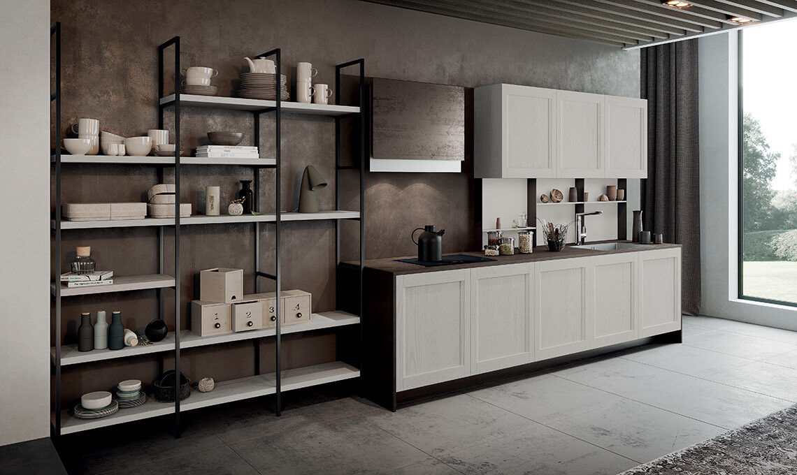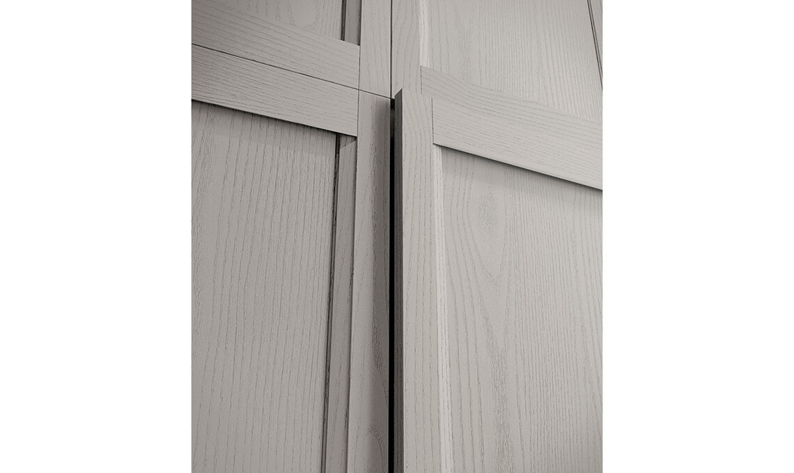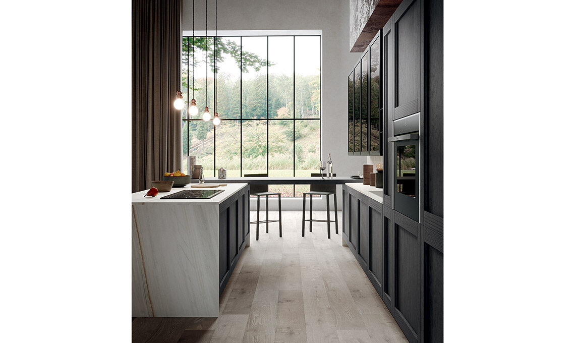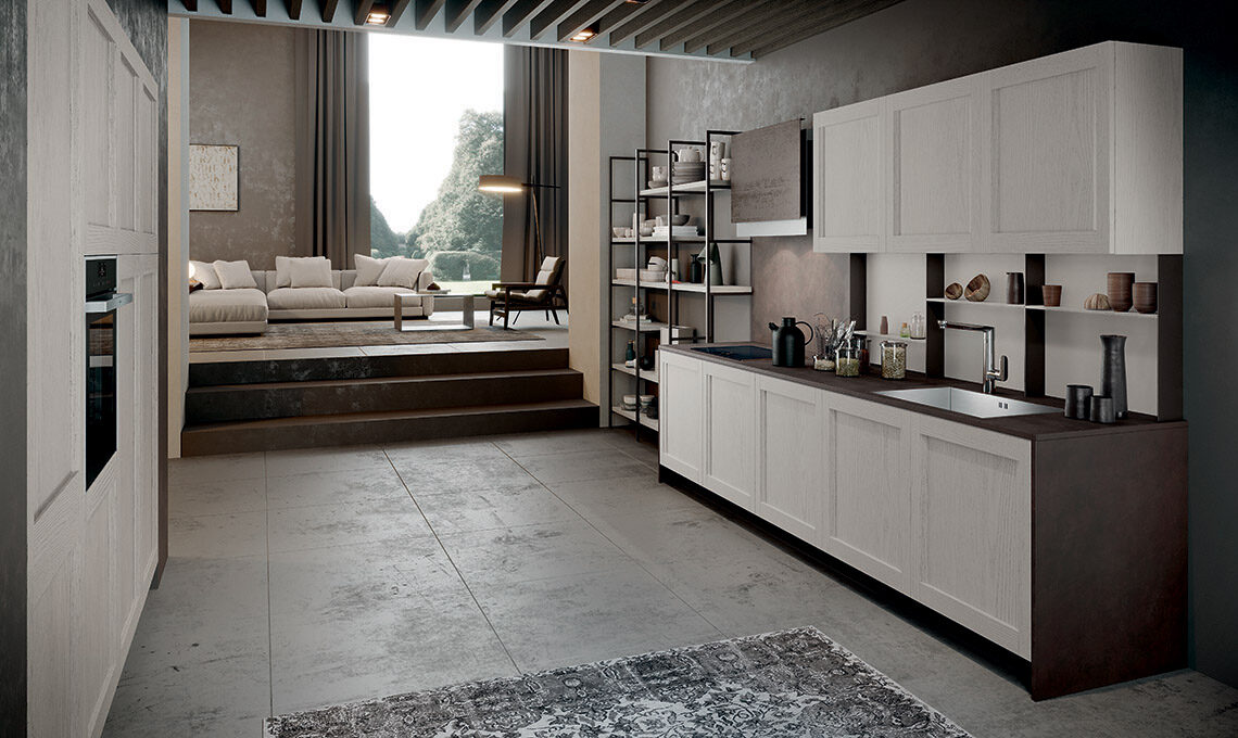 Grazie ad una gamma di finiture trasversali e a nuovi complementi dedicati, dà la possibilità di declinare la cucina nel 'gusto' che più ci appartiene: moderno, classico, arrivando anche al contemporaneo per rendere ogni cucina unica, come chi la sceglie. L’anta a telaio massello con particolare presa integrata la rende facile da abbinare a ogni scelta di finitura, si tratti di laccati poro aperto, decapè o nella combinazione con vetro.