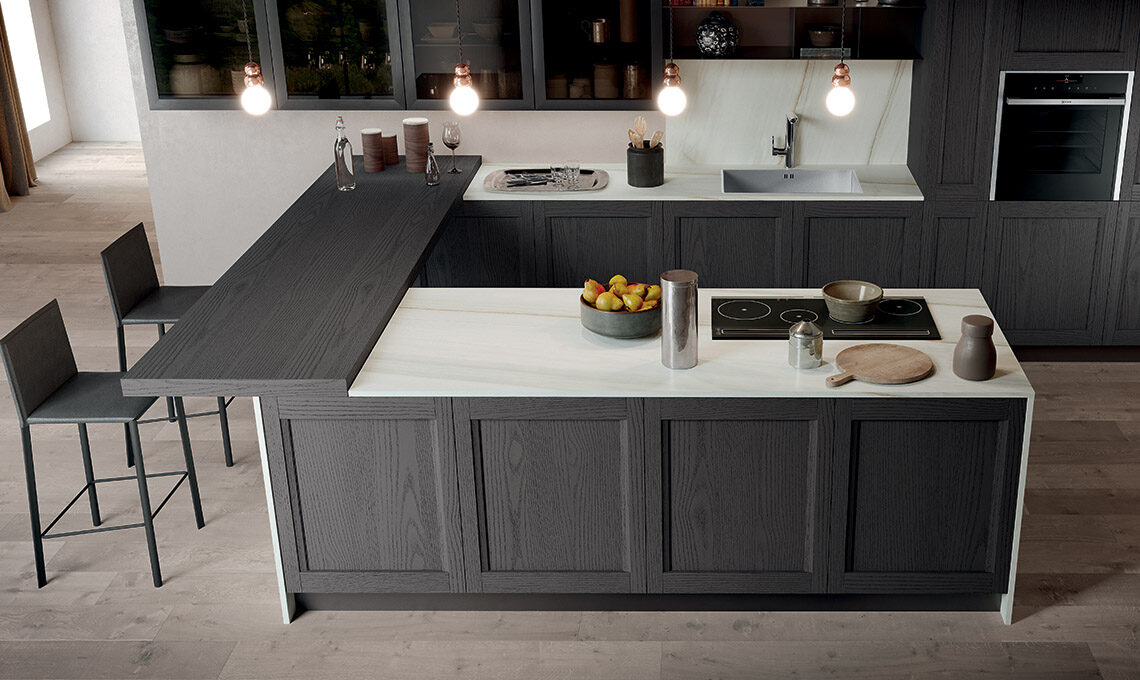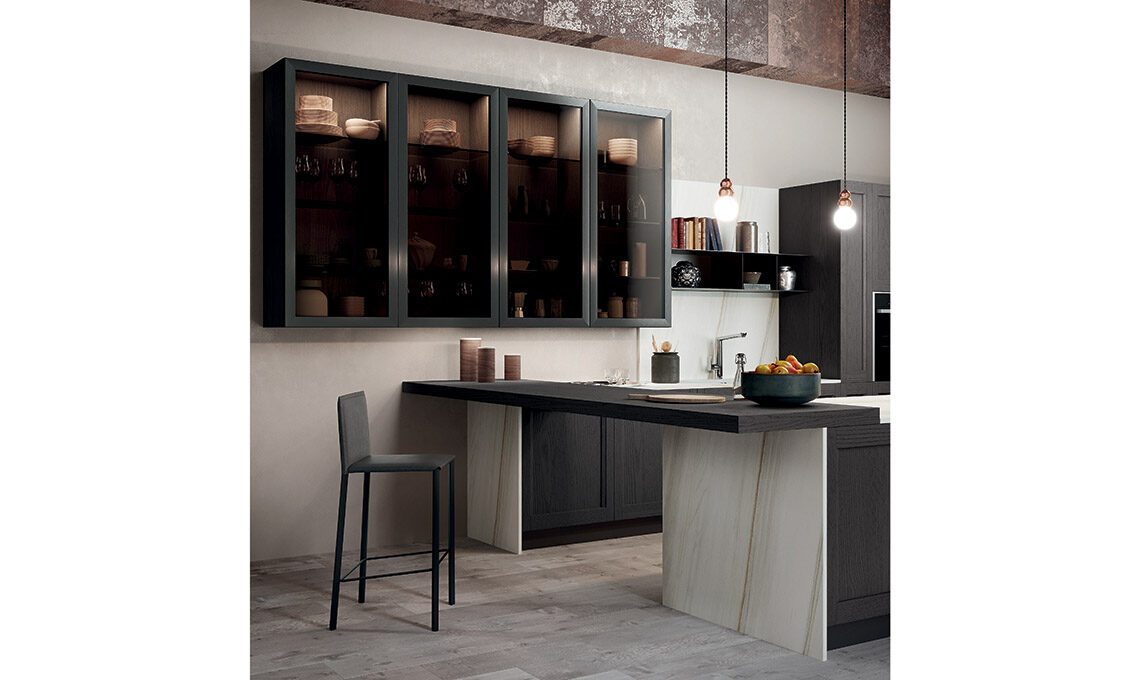 Cerchi un ambiente finemente attuale, moderno e complesso, dall’atmosfera aperta e ricco di dettagli eleganti e raffinati, giocata sui toni scuri? Ecco una composizione che ci porta al centro della cucina grazie all’ampia penisola, incorniciata dal top in ceramica Iris nella finitura Bianco Lasa, collegata dal piano snack, laccato poro aperto vulcano. A parete troviamo ampi pensili vetrina con ante in vetro fumé su telaio 'Factory' e colonne complete di contenitori ad estrazione con forno e frigo ad incasso. Questi elementi distintivi danno vita a una composizione originale e a un ambiente deciso che accentua la sensazione di convivialità grazie all’affaccio sulla zona pranzo.