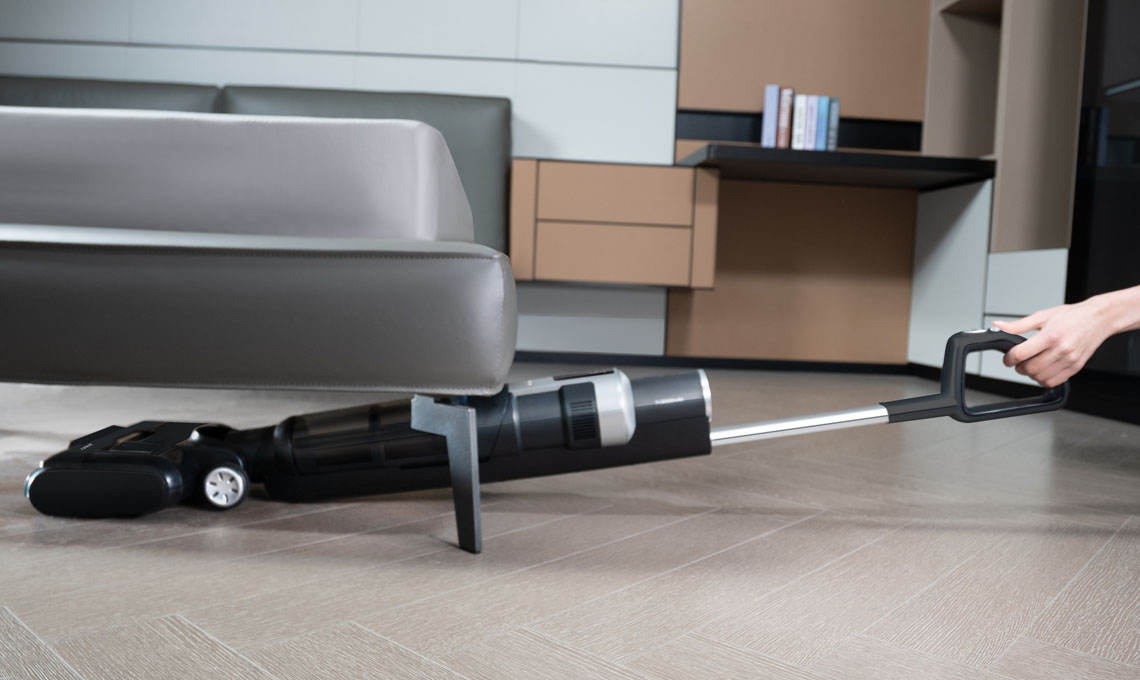 La versatilità del design della testina consente una pulizia accurata lungo le pareti e negli angoli spesso trascurati, mentre il manico flessibile a 180° si adatta con facilità agli spazi sotto i mobili più bassi, portando l'efficienza anche nei luoghi difficilmente accessibili.