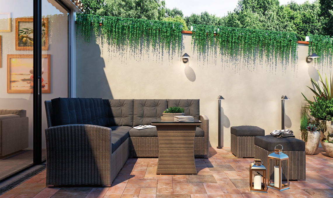Diversa è la proposta per lo stile metropolitano. Se hai bisogno di creare uno spazio riservato, lasciati convincere dal Pannello Mosaic in pvc, essenziale nelle linee ma con un design dall'appeal ricercato che renderà il tuo living outdoor molto particolare. Per il comfort invece, puoi optare per il Set Davenport in rattan sintetico con un divano a 5 posti, tavolino e puof abbinati: il tortora è il colore ideale per la città, ma puoi arricchirlo aggiungendo cuscini e tessili di colori sgargianti o pastello, a seconda del tuo gusto. Anche questo set è molto resistente agli agenti atmosferici, anche se è meglio proteggerlo fuori stagione. Il tocco di calore è dato dalla superficie: Leroy Merlin infatti ha pensato alla Serie Simplywood Listone Pieno, che puoi trovare in varie nuance, dal naturale al grigio, dall'ebano al tabacco e al bianco.