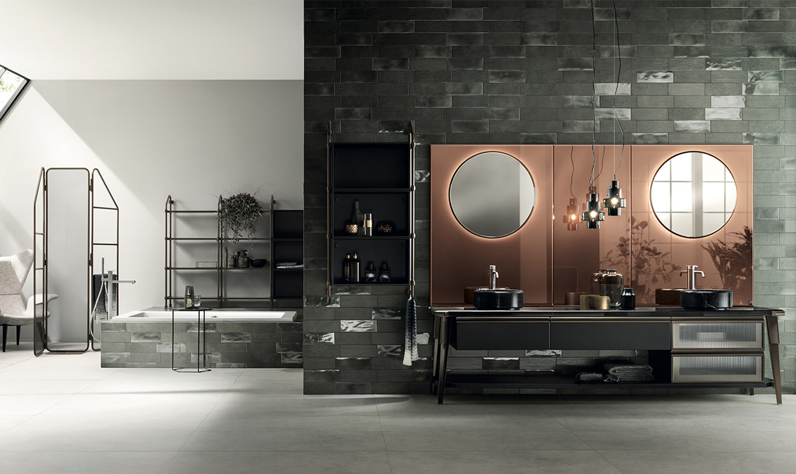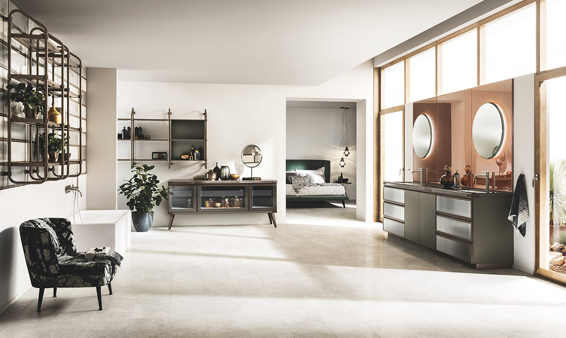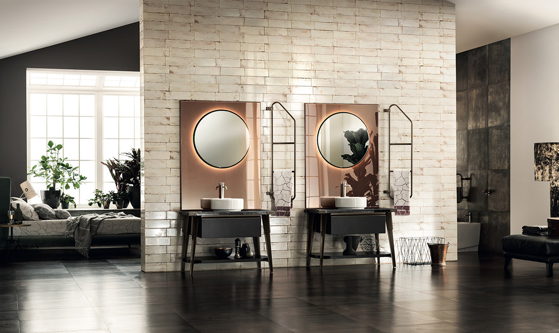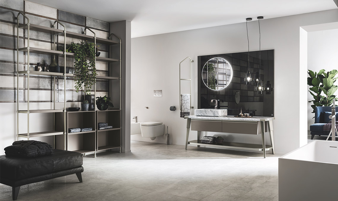 Lo stesso spirito caratterizza l'ambiente bagno: anche qui il sistema di scaffalature componibili Stock Rack esprime lo stile industrial e consente l'inserimento di mensole, vani a giorno, pensili e basi di diverse misure, a terra e sospese. La presa maniglia è anche in questo caso montata sulla testa dell'anta, mentre i lavabi in appoggio di forma rotonda o rettangolare dal design esclusivo vengono proposti in Mineralmarmo bianco e in marmo in diverse finiture. Un'ulteriore personalizzazione viene dalle specchiere, importanti elementi d'arredo.