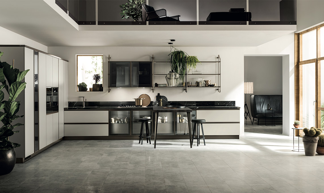 Un ambiente stiloso, dunque, ma reso confortevole dalle nuance opache e dall'impiego del vetro in due tipologie, Smoky Glass, vetro fumé con rete nera, o Ribbed Glass, vetro a losanghe. La cucina Scavolini Diesel Open Workshop è un ambiente personale e intimo, ma è anche un luogo di socialità, dove ogni dettaglio è pensato per mettere ognuno a proprio agio.