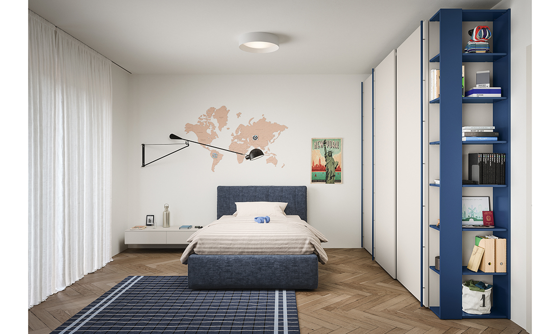 Oggi il letto diventa più accogliente, le mensole si rinnovano e la testata si appoggia dove prima c'era lo scrittoio, eliminando il pannello per fare spazio al colore.