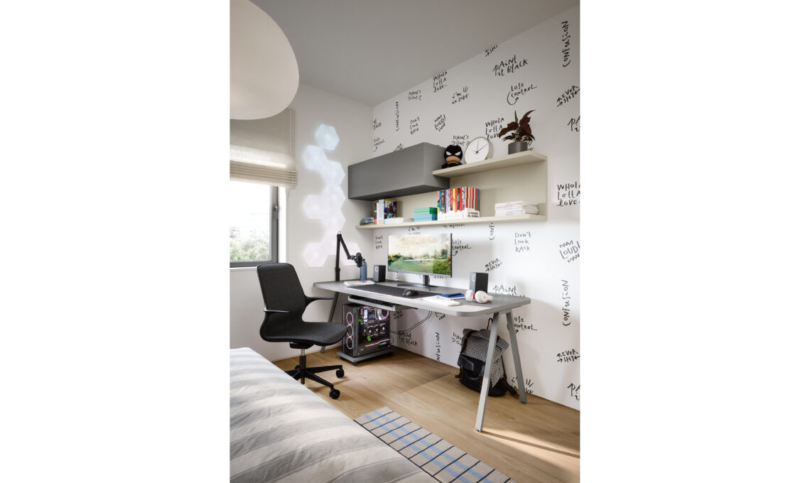 Innanzitutto sceglie una palette colori decisamente più ‘adulta’ e riorganizza tutti gli elementi. La parete che ospitava i due letti singoli viene interamente arredata con una struttura contenitiva che ha anche una parte a giorno, molto comoda per lasciare a disposizione i cambi d’abito per lo sport e per la scuola, ma anche zaini, borsoni, scarpe e… skateboard! La chicca che piace molto a Filippo è l’illuminazione integrata nella colonna libreria: rende visivamente meno pesante l’armadiatura e gli permette di tenere in ‘esposizione’ i suoi oggetti preferiti. Dove c’era il piccolo armadio condiviso col fratello, Filippo posiziona un grande e comodo letto (con un ampio contenitore perfetto per far ‘sparire’ anche gli accessori più ingombranti) inserito in una parete attrezzata con un pannello e una lunga mensola che danno continuità, oltre ad essere molto comodi per tenere libri e accessori in vista. La zona studio sfrutta lo spazio più ridotto accanto alla porta ed è personalizzata con un divertente carta da parati e attrezzata con un’ampia scrivania. Qui Filippo studia e gioca, ha trovato il posto giusto per i suoi libri ma anche una zona ideale per gli amati videogame. Gli esagoni luminosi sulla parete rispecchiano il suo stile e finalmente lo fanno sentire protagonista del suo personalissimo spazio.