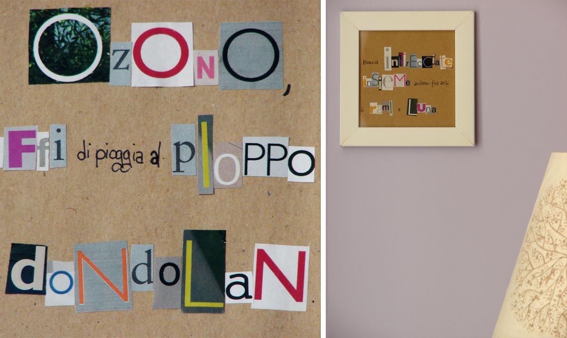 - Scegli quali parole risuonano meglio dentro di te, quelle che ritieni più significative. Quelle parole saranno formate da lettere che ritaglierai da vecchie riviste, con dimensioni, stile e colori diversi. Le altre saranno scritte a mano o stampate al pc, più in piccolo e con un colore e font uniforme.