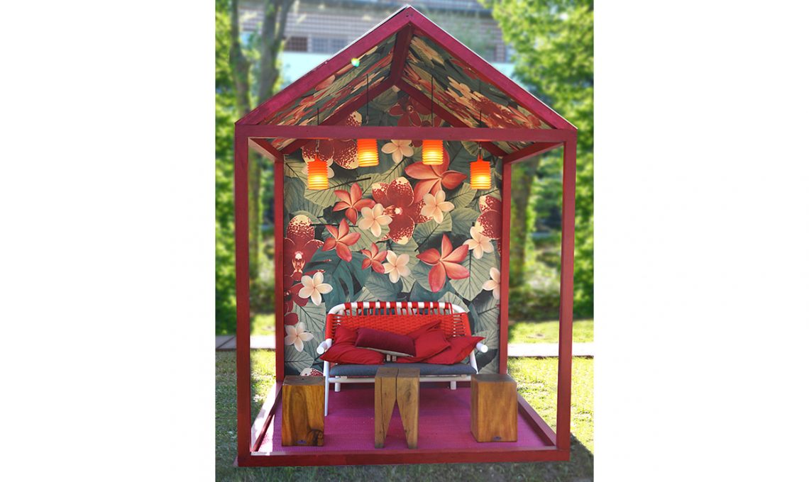 Carta da parati in vinile Tropics Reloaded [Wall & Deco?, su misura € 110/mq]. Pavimento sintetico, adatto agli esterni, Carnation [Bolon, prezzo su richiesta]. Lanterne in silicone con cavo in neoprene, H2 [Rotaliana, ø cm 15x27h €175]. Divanetto in legno con schienale intrecciato in corda nautica, Unam [Very Wood, cm 77x130x88h € 1.856]. Tavolino in rovere massello trattato a olio, ST04 Backenzahn [e15, cm 27x27x47h € 713]. Sgabello in legno massello Suar [Il giardino di legno, cm 27x40h da € 170].