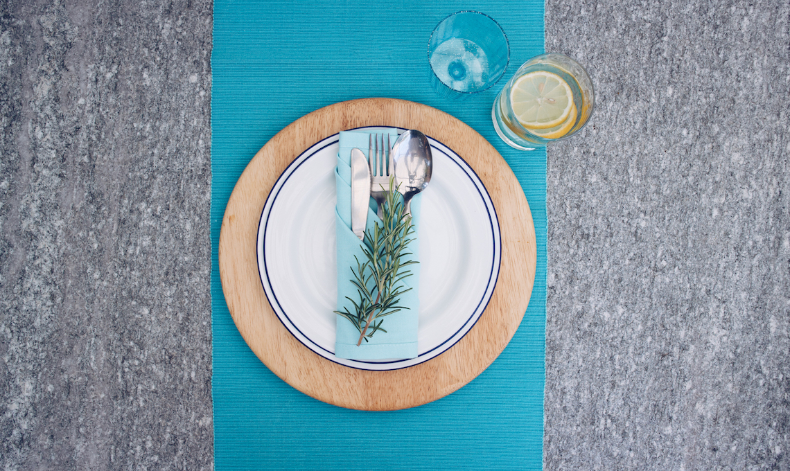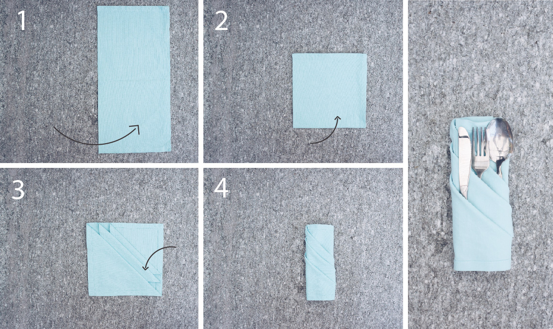 Il tovagliolo: un’altra idea semplice e di grande effetto è quella di piegare il tovagliolo creando delle tasche per le posate. Ti consiglio di utilizzare un tovagliolo in tessuto, ma in alternativa andrà benissimo anche uno in carta con una bella colorazione. Piegalo in quattro e successivamente piega 3 dei 4 strati in diagonale; ripiega i lati verso il retro e inserisci una posata per ogni tasca. Il dettaglio in più? Un profumatissimo rametto di rosmarino.