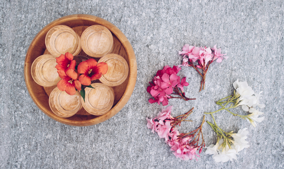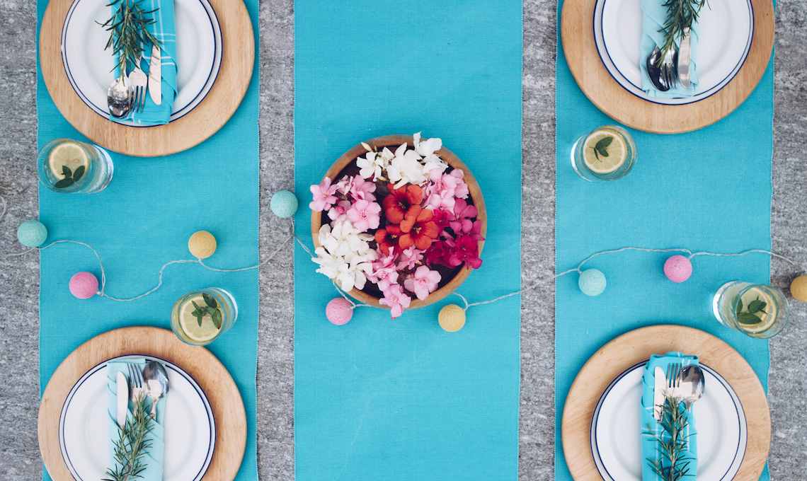 Il centrotavola: puoi utilizzare un contenitore (io ho scelto un cestino portafrutta in legno abbinato ai sottopiatti) riempito con banalissimi bicchieri d’acqua. Ti basterà raccogliere dei fiori e il vostro centrotavola sarà pronto in un attimo.