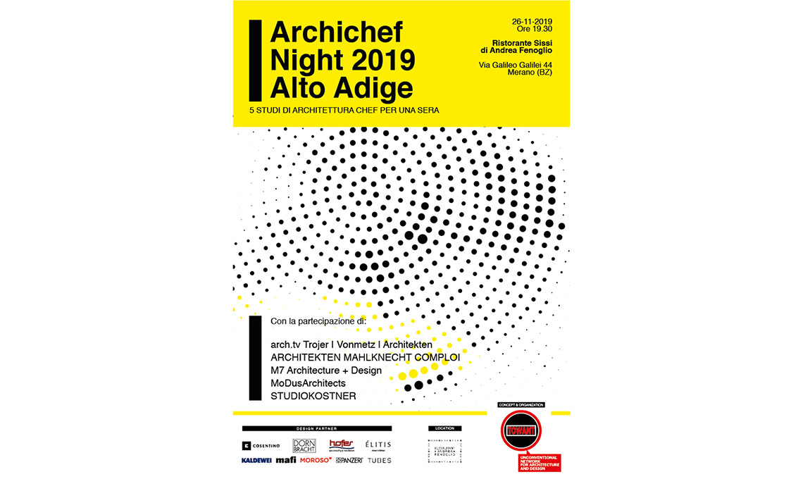 L’archi-menù della serata sarà realizzato dagli studi alto atesini: arch.tv Trojer, Vonmetz, Architekten, Architekten Mahlknecht Comploi, M7 Architecture + Design, MoDusArchitects e StudioKostner.