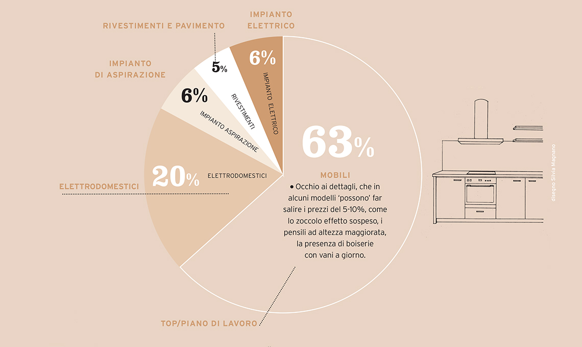 Occhio ai dettagli, che in alcuni modelli ‘possono’ far salire i prezzi del 5-10%, come lo zoccolo effetto sospeso, i pensili ad altezza maggiorata, la presenza di boiserie con vani a giorno.