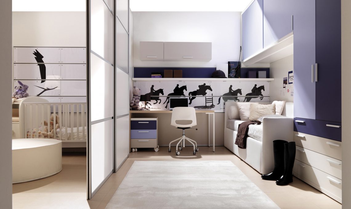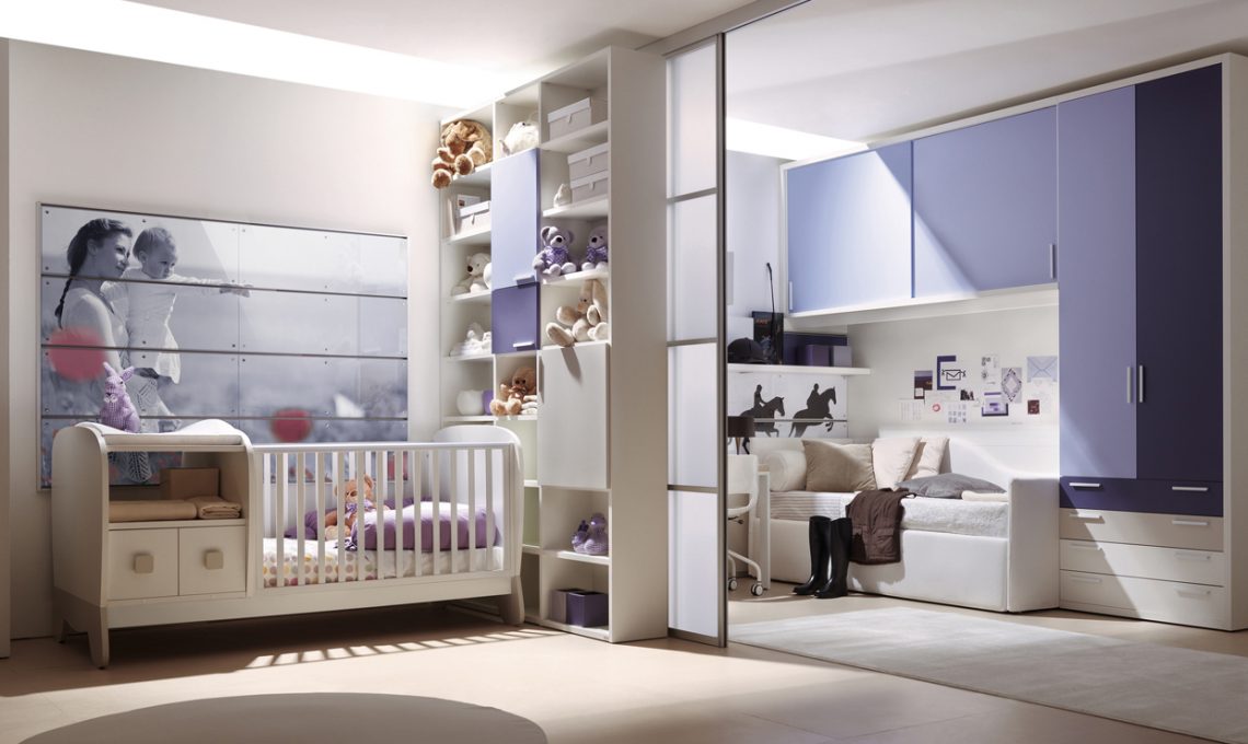 Due stanze in una con le librerie Over (cm 167,8x36,2x258,8h) più la porta scorrevole Anta Magica da cm 120x270h. Per il bebè: lettino trasformabile con 2 cassettoni (cm 190x96x98h) e boiserie [Doimo CityLine].